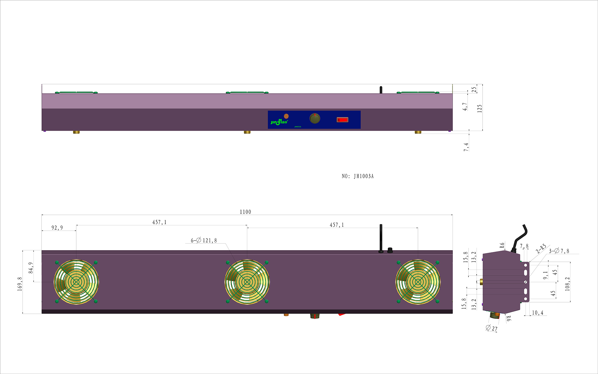 *JH1003A悬挂式三头离子风机的离子平衡电压和静电消除时间符合ESD标准,静电消除时间是从测试电压为1000V~100V测得。