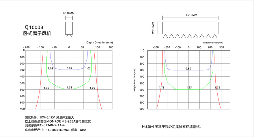 * Q1000B卧式离子风机的离子平衡电压和静电消除时间符合ESD标准,静电消除时间是从测试电压为1000V~100V测得。