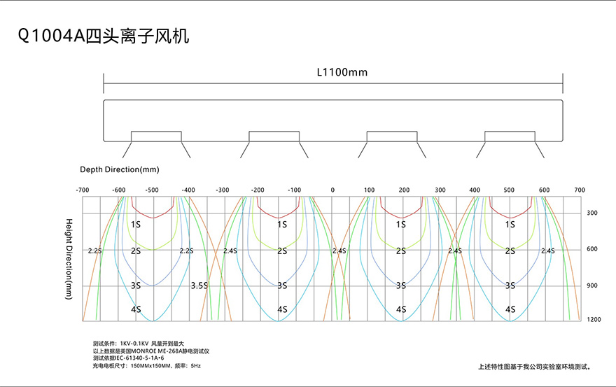 *Q1004A悬挂式四头离子风机的离子平衡电压和静电消除时间符合ESD标准,静电消除时间是从测试电压为1000V~100V测得。