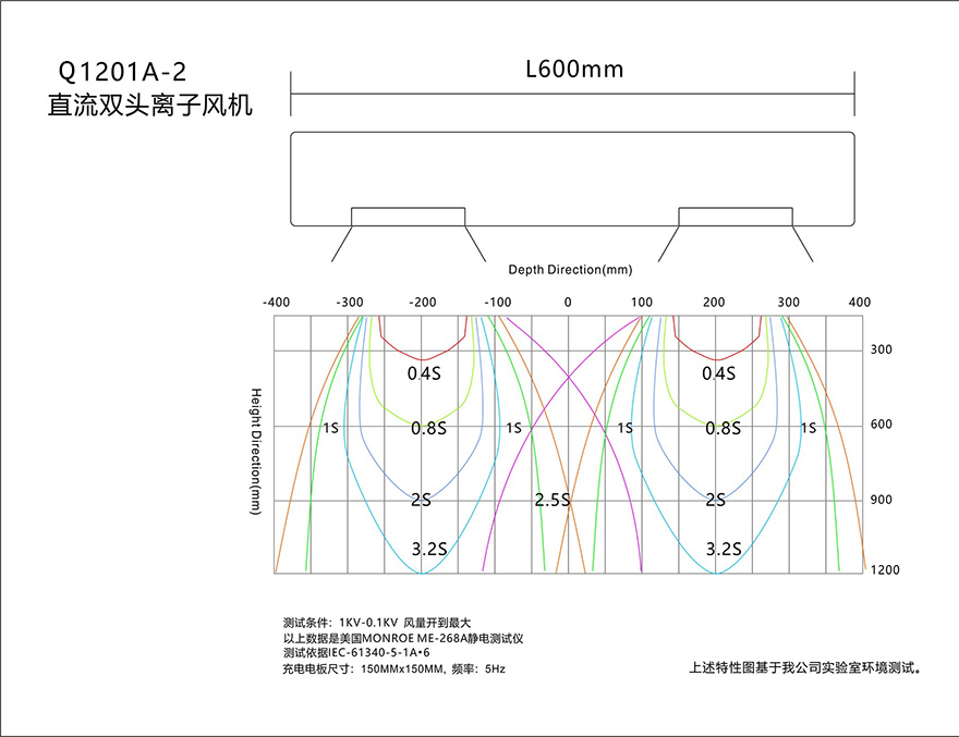 *吊挂式直流离子风机的离子平衡电压和静电消除时间符合ESD标准,静电消除时间是从测试电压为1000v~100v测得。
