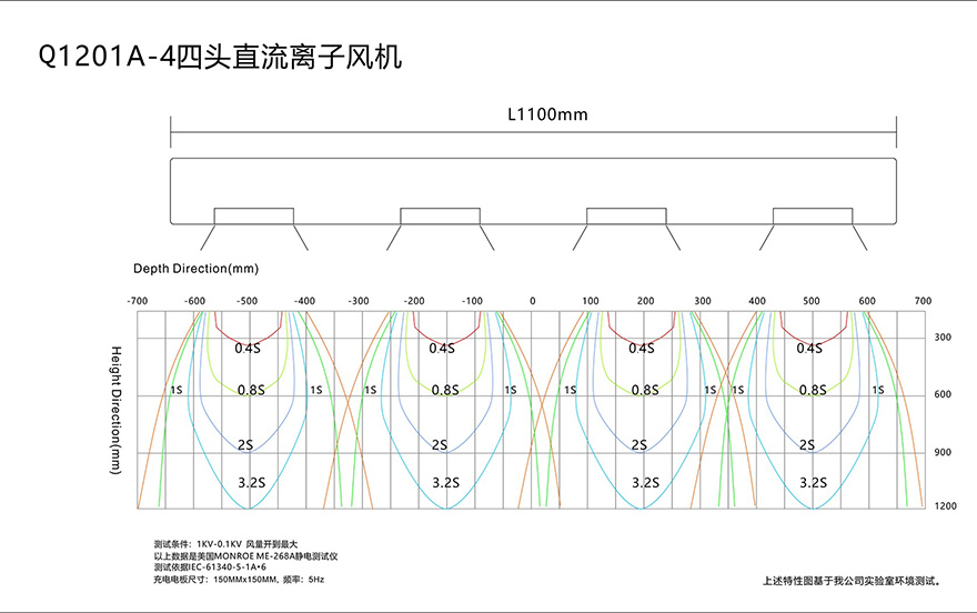 *吊挂式直流离子风机的离子平衡电压和静电消除时间符合ESD标准,静电消除时间是从测试电压为1000v~100v测得。