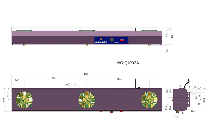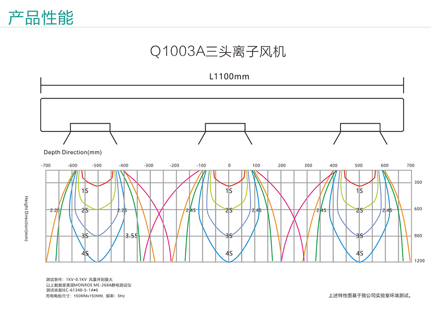 *Q1003A悬挂式三头离子风机的离子平衡电压和静电消除时间符合ESD标准,静电消除时间是从测试电压为1000V~100V测得。
