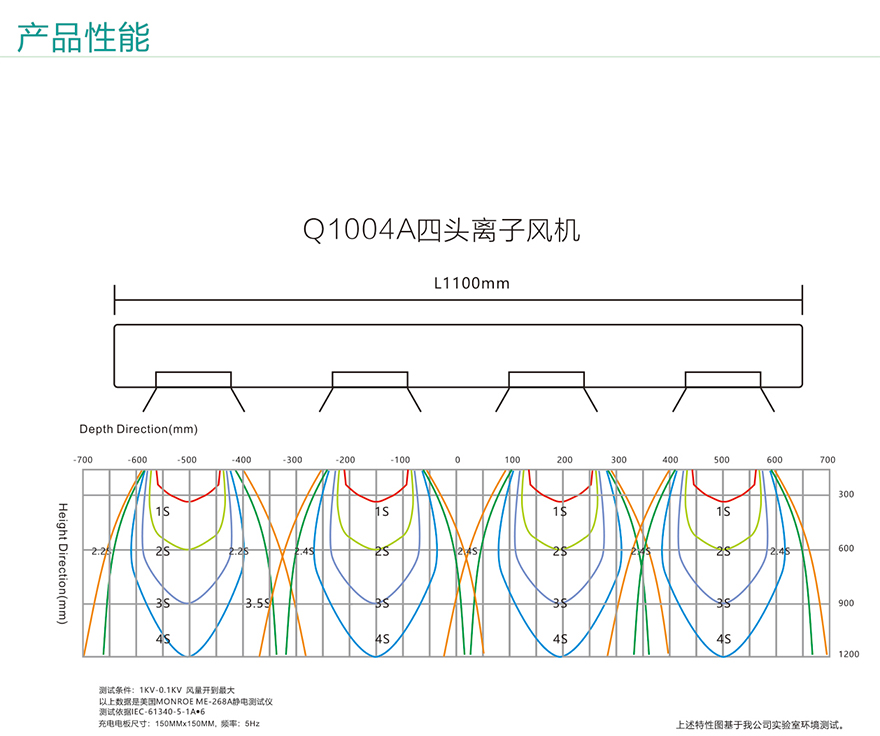 *Q1004A悬挂式四头离子风机的离子平衡电压和静电消除时间符合ESD标准,静电消除时间是从测试电压为1000V~100V测得。
