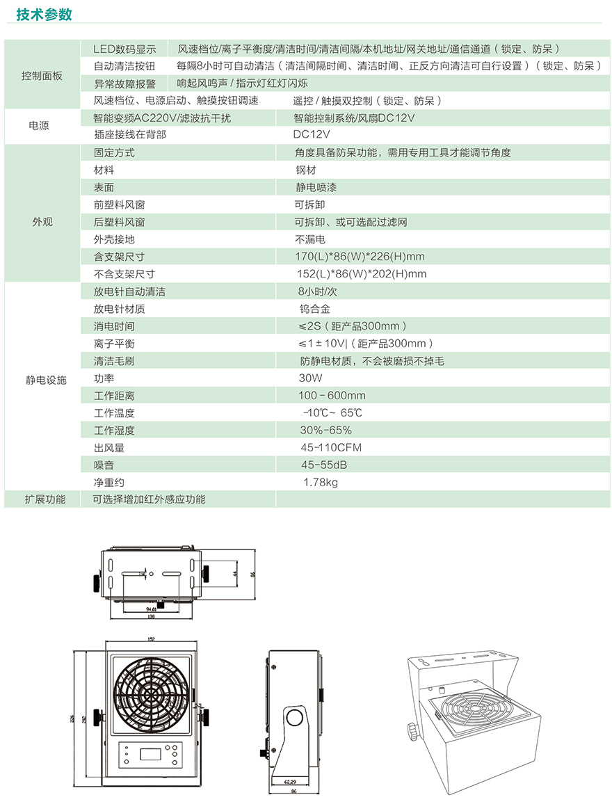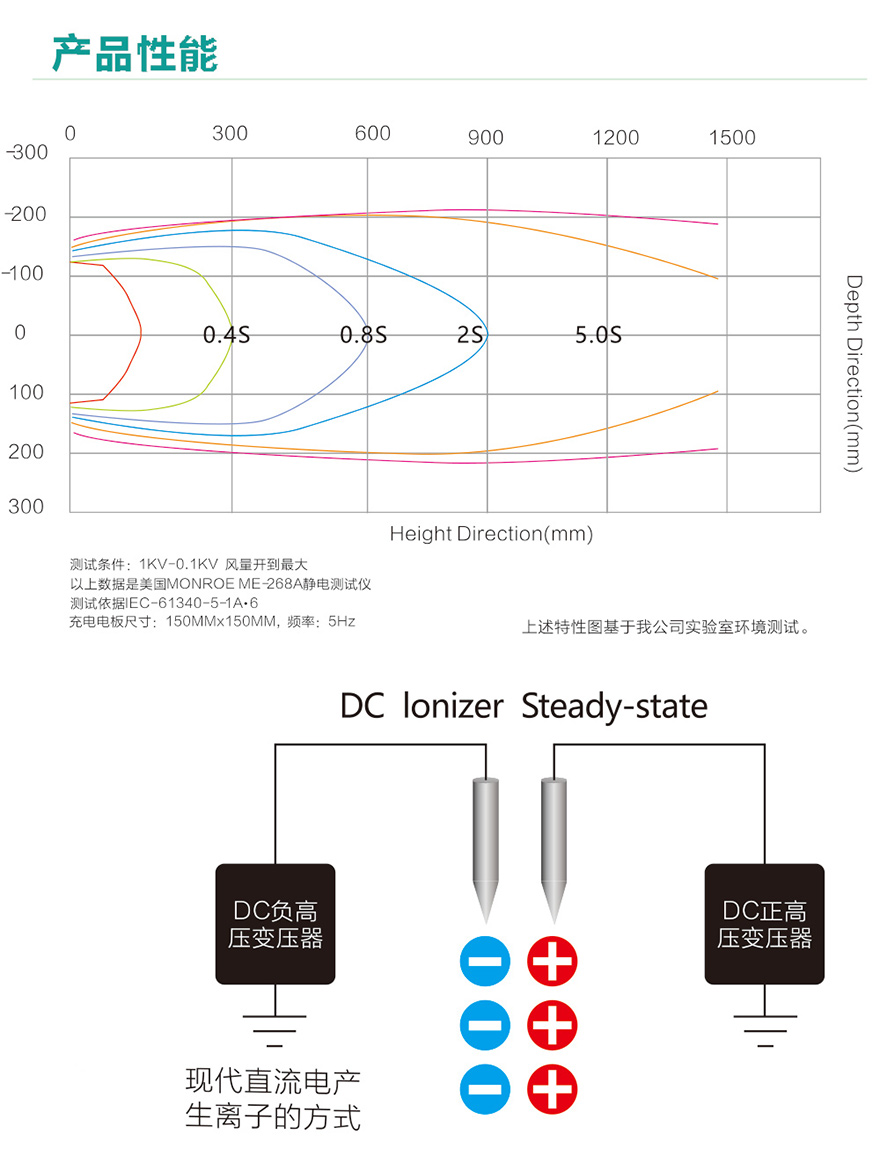 Q1301直流离子风机可产生大量的带有正负电荷的气流,可以将物体上所带的电荷中和掉。当物体表面所带为负电荷时,它会吸引气流中的正电荷; 当物体表面所带为正电荷时,它会吸引气流中的负电荷,从而使物体表面上的静电被中和,达到消除静电的目的。